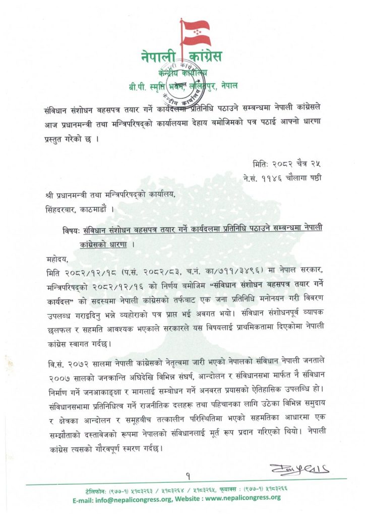 काठमाडौं । नेपाली कांग्रेसले सरकारले गठन गर्न लागेको संविधान संशोधनसम्बन्धी कार्यदलमा प्रतिनिधि पठाउनुअघि स्पष्ट धारणा सार्वजनिक गर्न माग गरेको छ ।