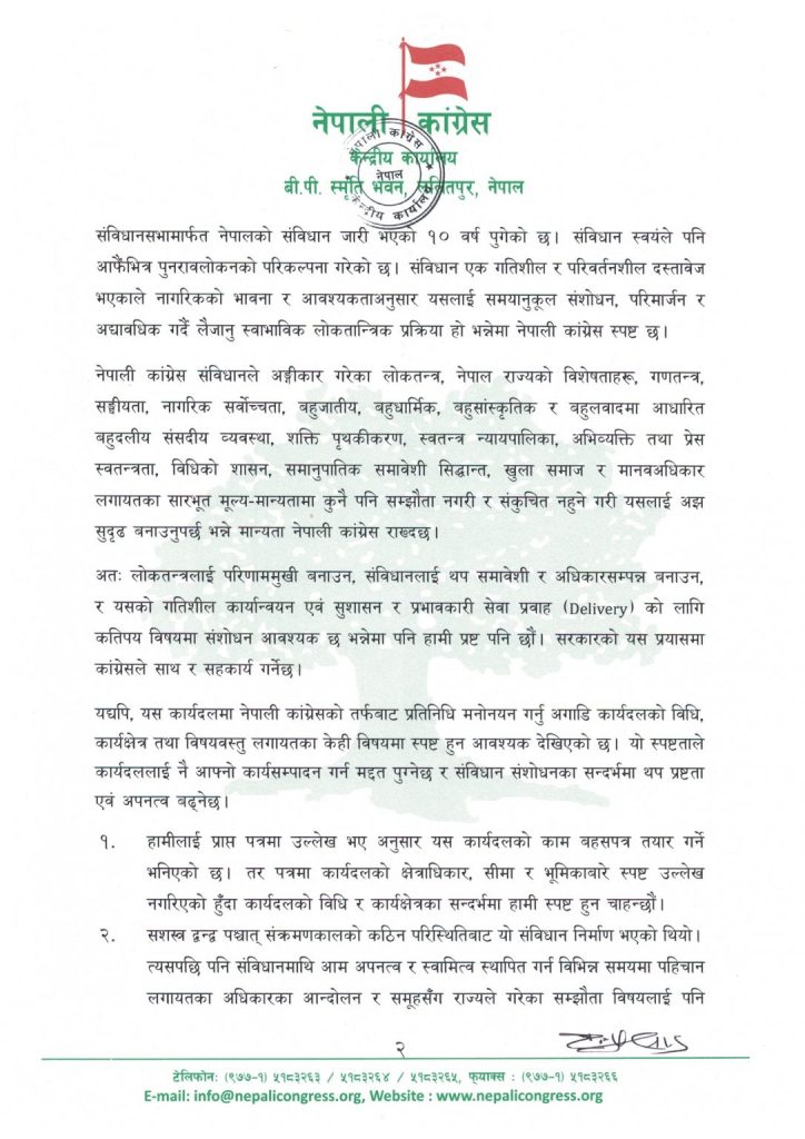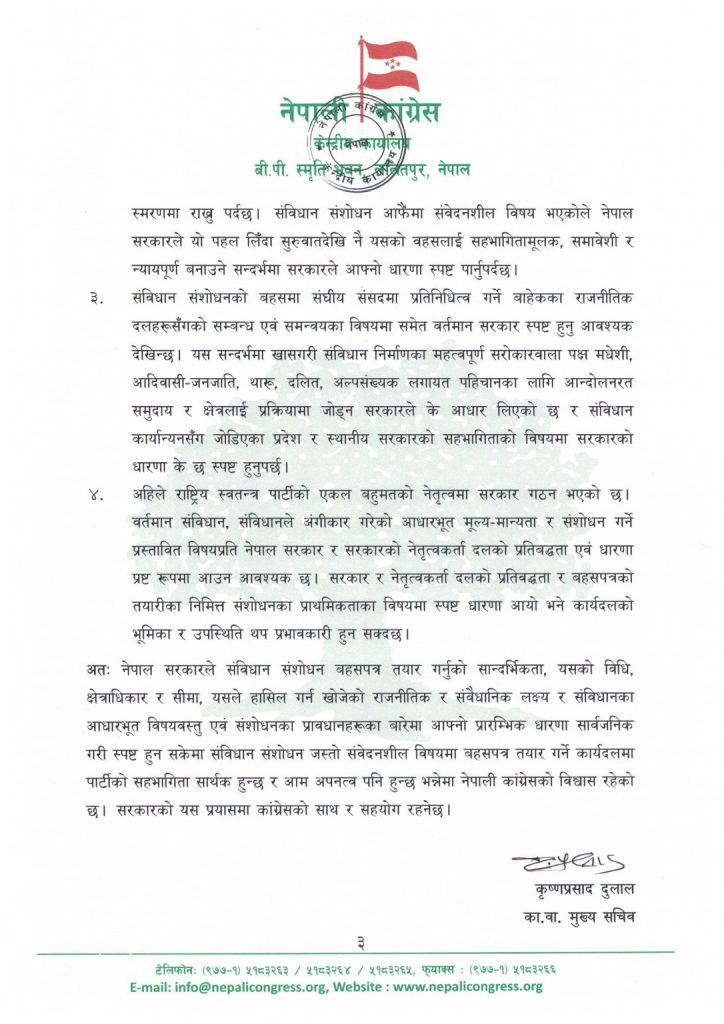 कार्यवाहक मुख्य सचिव कृष्णप्रसाद दुलालद्वारा जारी विज्ञप्तिमा पार्टीले कार्यदलको क्षेत्राधिकार, कार्यविधि र भूमिकाबारे सरकारको आधिकारिक स्पष्टता आवश्यक रहेको जनाएको हो । कांग्रेसले संविधान जारी भएको एक दशकपछि समयसापेक्ष संशोधन आवश्यक भएको स्वीकार गर्दै यस प्रक्रियामा सहयोग रहने प्रतिबद्धता जनाएको छ ।