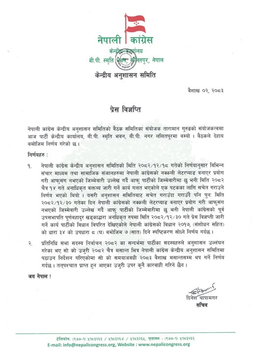 काठमाडौं । पार्टीका नेता पूर्णबहादुर खड्कालाई नेपाली कांग्रेसले सात दिनभित्र स्पष्टीकरण दिन निर्देशन दिएको छ । पार्टी केन्द्रीय अनुशासन समितिको सानेपास्थित केन्द्रीय कार्यालयमा बसेको बैठकले खड्काले पार्टीको नक्कली लेटरप्याड प्रयोग गरेको र आफूले नपाएको जिम्मेवारी उल्लेख गर्दै अनधिकृत वक्तव्य जारी गरेको ठहर गरेको हो ।