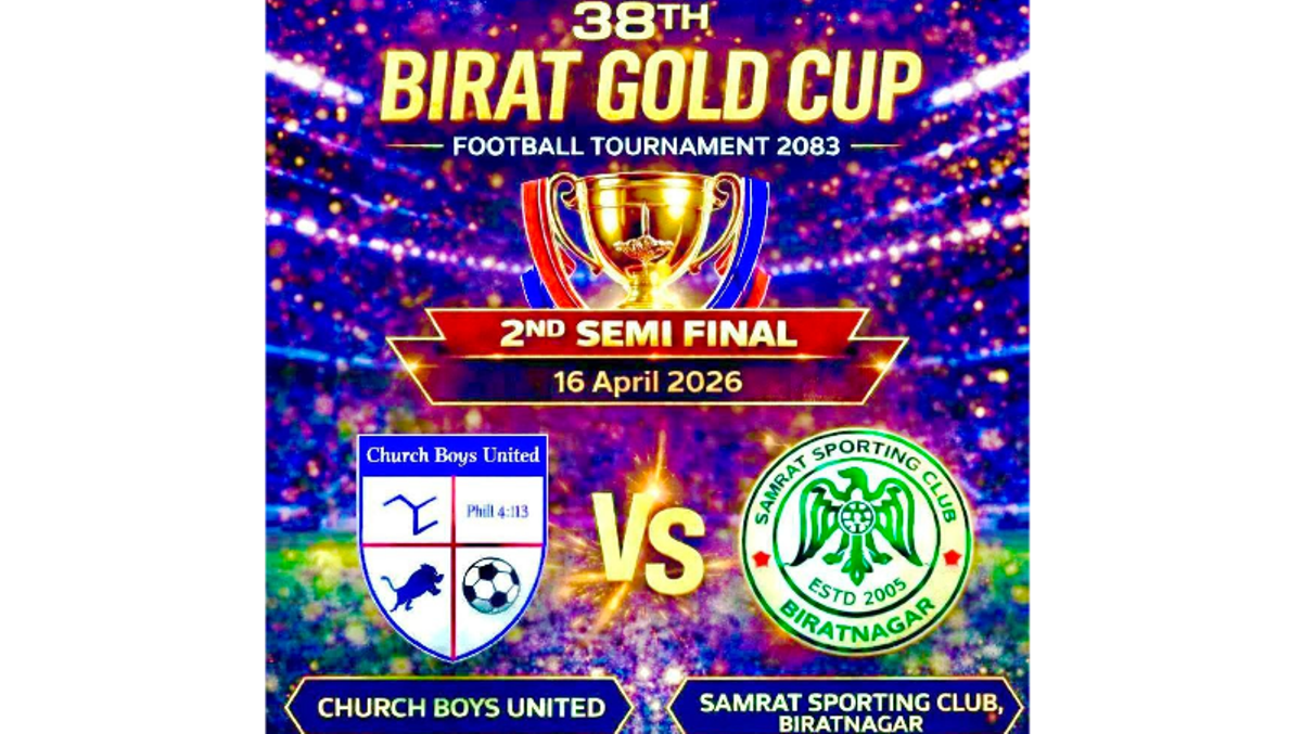 विराटनगर । विराटनगरमा जारी ३८ औँ संस्करणको विराट गोल्डकप फुटबल प्रतियोगिताको अन्तिम सेमिफाइनल खेलमा आज (बिहीबार) सम्राट स्पोर्टिङ क्लब विराटनगर र चर्च चर्च ब्वाइज युनाइटेडबीच दोहोरो भिडन्त हुँदैछ ।