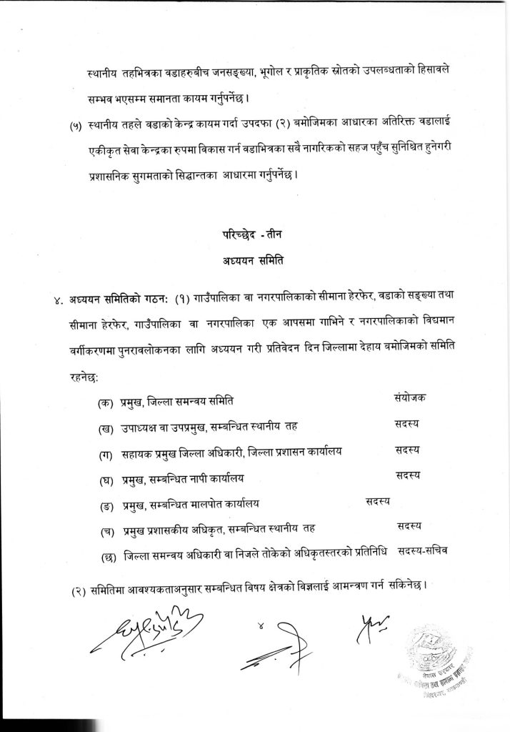 १। जिल्ला स्तरमा अध्ययन: सुरुमा जिल्ला समन्वय समितिका प्रमुखको संयोजकत्वमा अध्ययन समिति गठन गरिनेछ । यस समितिमा सम्बन्धित पालिकाका उपप्रमुख, नापी, मालपोत र प्रशासन कार्यालयका प्रतिनिधिहरू रहनेछन् । समितिले जनसंख्या र भूगोलका आधारमा अध्ययन गरी ३ महिनाभित्र प्रतिवेदन बुझाउनुपर्ने छ ।