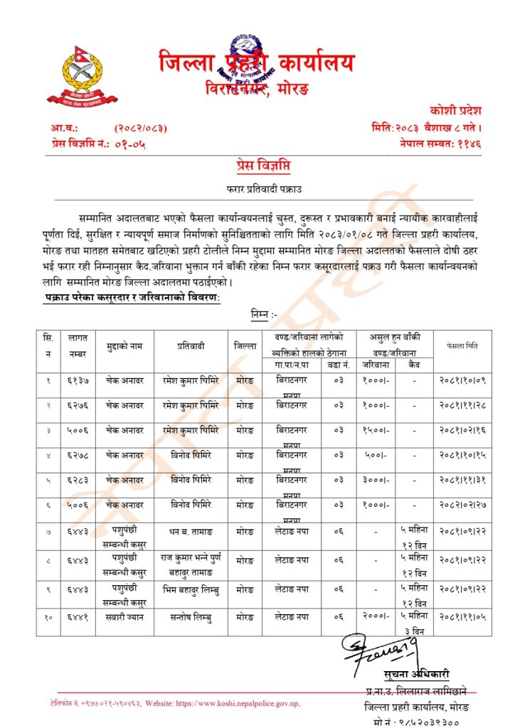 विराटनगर । अदालतले विभिन्न कसुरमा दोषी ठहर गर्दै कैद तथा जरिबानाको फैसला सुनाए पनि फरार रहेका प्रतिवादीहरुलाई पक्राउ गर्न मोरङ प्रहरी सक्रिय बनेको छ ।