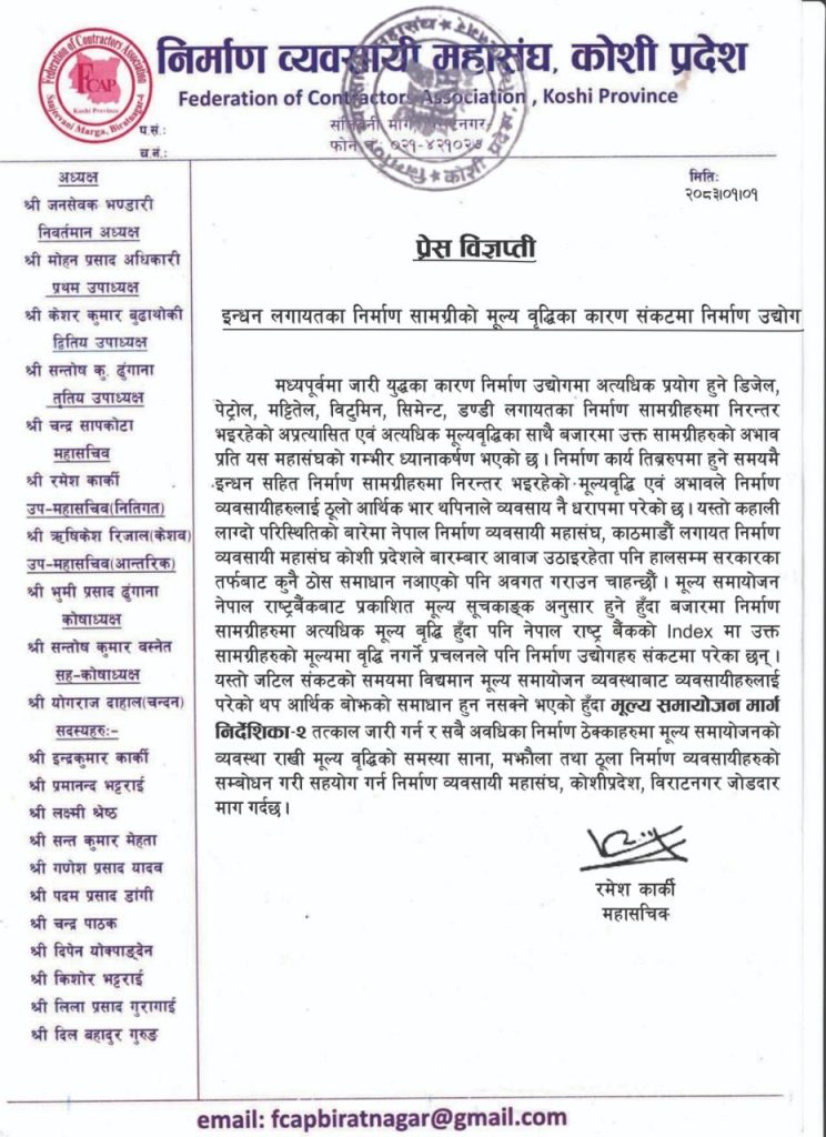 निर्माण व्यवसायी महासंघ कोशी प्रदेशका वरिष्ठ उपाध्यक्ष केशर बुढाथोकीका अनुसार अहिलेको अवस्था सामान्य आर्थिक समस्या नभएर ‘निर्माण आपतकाल’ जस्तै भइसकेको छ । उनी भन्छन्, ‘काम गर्ने सिजनमै लागत नियन्त्रण बाहिर गएको छ । यस्तो अवस्थामा काम गर्नु भनेको पूरै घाटा बेहोर्नु हो ।’