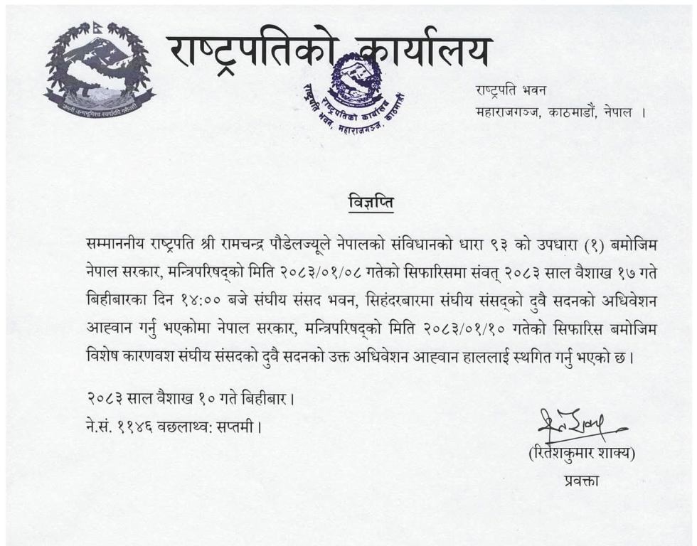 राष्ट्रपति कार्यालयका प्रवक्ता रितेशकुमार शाक्यका अनुसार बिहीबार बसेको मन्त्रिपरिषद् बैठकले संसद बैठक स्थगित गर्न औपचारिक सिफारिस गरेको थियो । सोही सिफारिसका आधारमा राष्ट्रपतिबाट अधिवेशन स्थगन गरिएको हो ।
